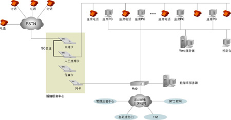 系統(tǒng)的核心是話路語音中心,主要實現(xiàn)兩大功能: 一是實現(xiàn)180系統(tǒng)的話路語音平臺; 二是實現(xiàn)與電話網(wǎng)絡(luò)的接口。以1臺Pentium級工控機(jī)作為處理平臺,2塊30線數(shù)字中繼語音處理卡,1塊帶振鈴器的24線模擬座席電話轉(zhuǎn)接卡,1塊4路傳真卡,卡間以語音處理行業(yè)的標(biāo)準(zhǔn)總線SC總線相連。系統(tǒng)與電信網(wǎng)絡(luò)的接口采用E1數(shù)字中繼線,信令方式采用中國一號信令為隨路信令,工控機(jī)用TCP/IP協(xié)議與局域網(wǎng)相連。