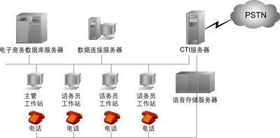 中型呼叫中心:座席代表在50~100之間。據(jù)專業(yè)數(shù)據(jù)統(tǒng)計公司預(yù)測,中型系統(tǒng)需求量最大,因此不少呼叫中心軟、硬件開發(fā)商對準(zhǔn)這一目標(biāo)進(jìn)行開發(fā)。這種系統(tǒng)結(jié)構(gòu)相對簡單,投資也少,容易被中、小企業(yè)所接受。目前我國的一些公司開發(fā)系統(tǒng)多屬于此種類型。它可以省掉大型交換機(jī)的投資,而利用PBX與CTI服務(wù)器和業(yè)務(wù)代表座席直接相連,業(yè)務(wù)代表席同時與應(yīng)用服務(wù)器相連,客戶資料也存在應(yīng)用服務(wù)器中,可實時地將接入電話的客戶姓名自動在計算機(jī)屏幕上彈出。CTI服務(wù)器一般由CTI硬件開發(fā)商的板卡和PC組成,其擴(kuò)容和增加功能也比較方便,成本也低,因此是一種投資小、見效快、升級也很靈活的系統(tǒng)。