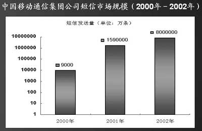 信息產(chǎn)業(yè)部預測,2003年我國手機用戶將增加5000多萬,手機用戶短信普及率有可能從2002年的40%增加到60%。按照這種預測,2003年,全國短信發(fā)送量將達到2000億條。