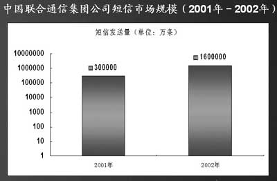 “從2001年的189億條增長到2002年的超過900億條,我國短信業(yè)務的增長率是移動用戶數(shù)增長率的3.4倍! 計世資訊分析師許牧說。