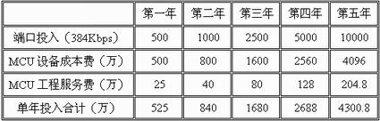 第一年建設(shè)500端口MCU,以后根據(jù)用戶發(fā)展情況逐年增加,每端口速率為384Kbps ,每端口設(shè)備成本為1萬元,逐年下降20%。MCU工程服務(wù)費按照設(shè)備費用的5%計算,包括設(shè)備運保費、安裝調(diào)試費。