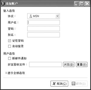 輸入用戶(hù)信息:接下來(lái),依次輸入MSN(或ICQ等)的用戶(hù)名和密碼,注意用戶(hù)名要輸入完整,至于“別名”當(dāng)然是你的昵稱(chēng)啦。如果你不希望下一次登錄時(shí)再輸入密碼的話(huà),可以選中“記住密碼”和“自動(dòng)登錄”復(fù)選框。