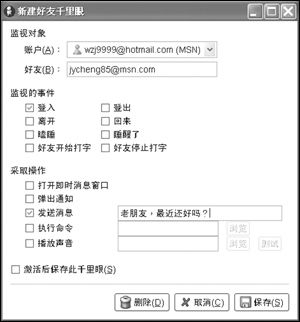 MSN可以在好友登錄時(shí)設(shè)置提示,但卻無(wú)法像QQ一樣自動(dòng)發(fā)出特定問(wèn)候,這未免有些遺憾。在Gaim中,我們可以為那些暫時(shí)不在線(xiàn)的好友添加千里眼監(jiān)視功能(如圖3),這里可以監(jiān)視的事件包括登入、登出、離開(kāi)、回來(lái)、瞌睡、睡醒了、好友開(kāi)始打字、好友停止打字等等,而可以設(shè)置的提示方式是打開(kāi)即時(shí)消息窗口、彈出通知、發(fā)送消息、執(zhí)行命令、播放聲音等等,非常豐富!