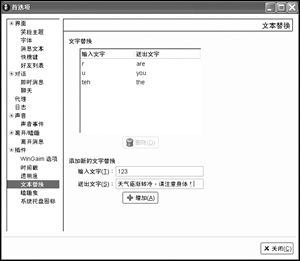 文本替換:根據(jù)用戶(hù)自定義的規(guī)則替換發(fā)出的消息,其實(shí)差不多類(lèi)似于縮寫(xiě)功能,你可以把一段話(huà)定義成一個(gè)字母,以后只要輸入這個(gè)字母,就會(huì)直接顯示這段話(huà)了。比如在缺省設(shè)置下,輸入“r”即可送出“are”,輸入“u”即可送出“you”(如圖7)。