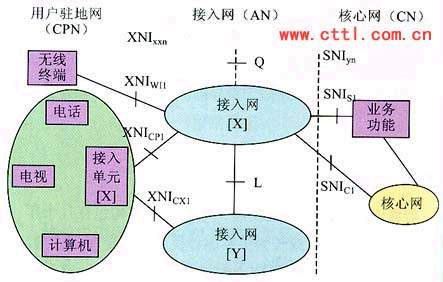 在圖中,XNI為接入網(wǎng)與用戶駐地網(wǎng)的接口,SNI為接入網(wǎng)到核心網(wǎng)之間的接口,L參考點為不同接入網(wǎng)之間的接口參考點。下一代的接入網(wǎng)應綜合利用多種手段在XNI和SNI之間提供有質量保證的基于分組的寬帶的傳送承載能力。下一代網(wǎng)絡的接入網(wǎng)應具有以下特點: