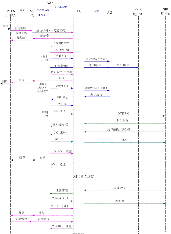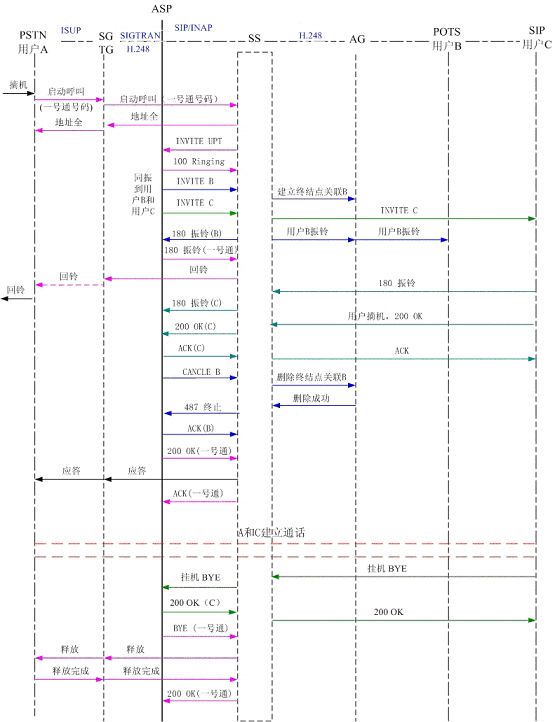圖4為PSTN用戶A撥打一號通用戶,同振到軟交換域AG下POTS用戶B和SIP用戶C,其中軟交換和應(yīng)用服務(wù)器以SIP協(xié)議相連,軟交換和AG、軟交換和TG以H.248協(xié)議相連?梢钥吹,用戶B和用戶C同時振鈴,用戶C摘機(jī)應(yīng)答,應(yīng)用服務(wù)器取消了對用戶B的振鈴。雙方通話,通話結(jié)束,用戶C掛機(jī),系統(tǒng)釋放了連接。