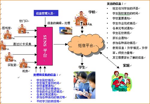 從上圖可以看到,在建立了SUNS校園綜合管理短信平臺(tái)以后,學(xué)生在校的活動(dòng)可以通過信息采集系統(tǒng)收集,在進(jìn)行后臺(tái)信息處理的同時(shí),建立一個(gè)與學(xué)生家庭直接溝通渠道。