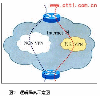 從圖2可以看出,邏輯隔離是在現(xiàn)有的運營商數(shù)據(jù)網(wǎng)基礎(chǔ)上,利用已經(jīng)比較成熟的VPN(如MPLSVPN)技術(shù)將網(wǎng)絡(luò)資源進行隔離:將網(wǎng)絡(luò)劃分為兩個邏輯子網(wǎng),一個是Internet業(yè)務(wù)子網(wǎng),另一個是NGN業(yè)務(wù)子網(wǎng)。兩個子網(wǎng)通過VPN進行隔離。NGN業(yè)務(wù)與Internet業(yè)務(wù)的區(qū)分在邊緣路由器PE上完成,PE根據(jù)物理接口或邏輯接口區(qū)分業(yè)務(wù)的類型,邏輯接口可以是VLAN,PVC等。在NGN子網(wǎng)中,再有針對的對QoS以及安全等問題進行解決。