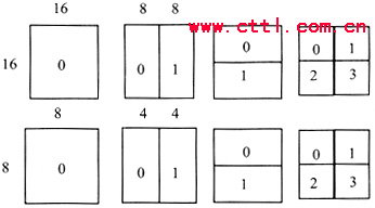 (1)塊的大小可變。在運(yùn)動估計(jì)時(shí),可以靈活地選擇塊的大小。在宏塊(MB)劃分上,H.264采用了16×6,16×8,8×16,8×8四種模式;當(dāng)劃分為8×8模式時(shí),又可進(jìn)一步采用8×4,4×8,4×4三種子宏塊劃分模式(見圖1)進(jìn)一步劃分,這樣做既可以使運(yùn)動物體的劃分更加精確,減小運(yùn)動物體邊緣的銜接誤差,又可以減小變換過程中的計(jì)算量。當(dāng)對較大的平滑區(qū)域采用Intra_16×16的幀間預(yù)測方式時(shí),為減小小尺寸變換帶來的塊間灰度差異,H.264采用了對亮度數(shù)據(jù)的16個4×4塊的DC系數(shù)進(jìn)行第二次4×4變換,對色度數(shù)據(jù)的4個4×4塊的DC系數(shù)進(jìn)行22變換的方式。
