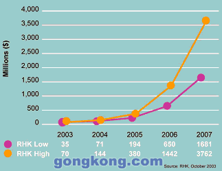 圖1是RHK咨詢公司所作的2003年度ATCA市場調(diào)查結(jié)果,一個(gè)重要特征是市場規(guī)模的最大值與最小值之間存在相當(dāng)大的差距,這反應(yīng)出ATCA在市場覆蓋和應(yīng)用范圍存在的不確定性,對(duì)于ATCA供應(yīng)商和使用者面臨的挑戰(zhàn)就是需要采取必要的措施發(fā)揮市場潛力,使包括服務(wù)提供商、TEM和計(jì)算平臺(tái)與模塊廠商在內(nèi)的整個(gè)產(chǎn)業(yè)利益最大化。