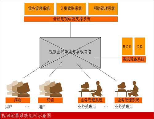 視訊會議運(yùn)營網(wǎng)絡(luò)中最主要的組成部分是運(yùn)營支撐系統(tǒng)和視訊硬件平臺,其中支撐系統(tǒng)負(fù)責(zé)對視訊業(yè)務(wù)的開展進(jìn)行管理和監(jiān)控,而視訊硬件平臺為視訊業(yè)務(wù)的開展提供硬件支持。
