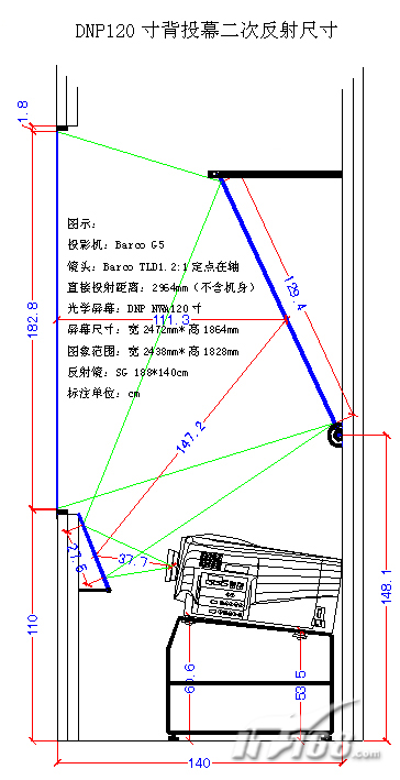 在我們掌握了所有與投影有關(guān)的環(huán)境數(shù)據(jù)后,就必須利用AutoCad軟件進(jìn)行模擬制圖是一個(gè)非常有效、快捷且精確的方法。因?yàn)锽arco Lens軟件修正后的計(jì)算值不需要考慮投影機(jī)鏡頭的長(zhǎng)度,所以我們可以精確計(jì)算出120英寸直接投影需要的背投房總深度=投影光程2964mm+投影機(jī)機(jī)身深度795mm+安裝空間100mm=3859mm。按比例在AutoCad上先制作直接在軸投射的圖紙,再利用軟件的“鏡像”功能,反復(fù)調(diào)整反射鏡的距離和角度,直到投影機(jī)頂部與屏幕最接近但不遮光為止(盡量避免反射鏡需要很大的仰臥角度),由于目前良好的真空鍍膜反射鏡反射率都高達(dá)94%以上,所以二次折射投影不會(huì)對(duì)亮度造成明顯的損耗。