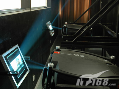 為了達(dá)到足夠大的尺寸,主屏幕采用SEAPRINE圖像控制器組成的1*2拼接,也就是采用了兩臺(tái)BARCO G5投影機(jī)來(lái)確保畫面的一流效果。不過(guò)由于投影距離的限制,這個(gè)方案里采用了二次反射系統(tǒng)。這也是這套方案的一個(gè)要點(diǎn)和關(guān)鍵。因?yàn)楹芏喙こ處熇靡恍└怕蕘?lái)估算一次或多次折射可以縮短的投影距離,但欠缺科學(xué)和嚴(yán)謹(jǐn)?shù)膽B(tài)度,因?yàn)檫@個(gè)數(shù)據(jù)與屏幕安裝高度、投影方式(離軸或偏軸)、投影機(jī)體積、反射鏡面積等息息相關(guān)。