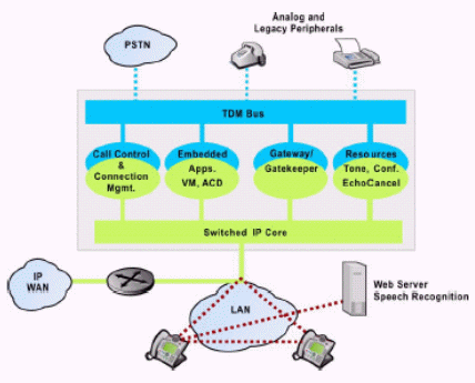 IP Enabled類IP-PBX的核心交換還是基于64K的傳統(tǒng)TDM交換網(wǎng)絡(luò),由一條傳統(tǒng)TDM BUS進行控制,IP業(yè)務(wù)的支持需外接網(wǎng)關(guān)(可為內(nèi)置插板或外置模塊),其優(yōu)點與傳統(tǒng)TDM PBX完全相同,缺點是由于核心交換帶寬的限制,無法實現(xiàn)與寬帶數(shù)據(jù)網(wǎng)絡(luò)的無縫集成,IP業(yè)務(wù)支持有限,一般僅為IP Networking和一些簡單IP桌面設(shè)備,而且網(wǎng)絡(luò)的透明度和IP桌面設(shè)備的功能都不太盡如人意。