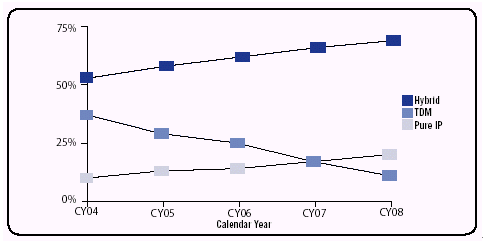 下圖是北美著名的市場分析和預(yù)測機構(gòu)Infonetics Research對以上三類PBX市場占有率統(tǒng)計和預(yù)測,圖中可以明顯看到雙總線類的IP-PBX的市場主導(dǎo)地位(圖中TDM指的就是IP-Enabled類的IP-PBX)。