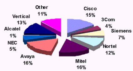 前面的一些統(tǒng)計數(shù)據(jù)是針對TDM PBX來說的,那么敏迪在IP-PBX的表現(xiàn)如何呢?敏迪自從2001年推出第一臺IP-PBX--3300 ICP起,在IP-PBX市場占有率節(jié)節(jié)攀升,2004年第二季度在美國的發(fā)貨量已經(jīng)與Avaya并列第一位(見右圖,來自Infotech,2004八月)。根據(jù)Synergy Research Group (SRG) 的題目為"2005年第二季度的企業(yè)語音市場占有率"的研究報告,敏迪的銷售以季度20%的增長率持續(xù)增長,增長率超過 Avaya,思科和北電在上一個季度的增長率,鞏固了在中小型商業(yè)用戶市場的占有率排名第一的地位,并超過了在此領(lǐng)域的4個主要競爭對手(3Com,Shoretel, Sphere和Vertical)占有率的總和。最近出版的Infonetics關(guān)于"2005年第二季度企業(yè)級IP-PBX全球市場分析和預(yù)測"的報告中將敏迪列為該季度世界上第二大IP-PBX供應(yīng)商,發(fā)貨量占21%,僅排在阿爾卡特之后,位列Avaya和北電之前,比去年同期增長了2個百分點。