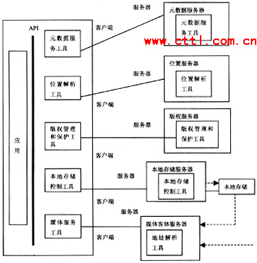 在DAVIC1.5AnytimeAnywhere文件中所規(guī)定的模型如圖2所示。在該圖中沒有描述任何與網(wǎng)絡相關(guān)的內(nèi)容。僅規(guī)定出在客戶端設(shè)備和服務器端設(shè)備中應當包含的功能模塊。即:元數(shù)據(jù)服務、位置解析、版權(quán)管理和保護、本地存儲控制、媒體服務。其基本思想為,在服務器端提供的所有功能。在客戶端設(shè)備中應包含有相關(guān)的軟件工具。在業(yè)務的具體實施過程中,客戶端首先向服務器端請求幫助查找其感興趣的媒體內(nèi)容,由元數(shù)據(jù)服務器處理并返回相關(guān)信息。通過位置解析服務器來確定客戶端所選擇的媒體內(nèi)容所在的位置;經(jīng)過媒體管理和保護服務器的認可:由本地存儲服務器向用戶提供媒體信息同時允許客戶端對媒體信息進行控制。