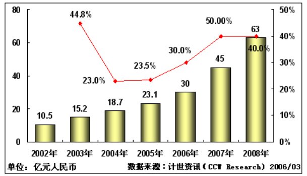 計(jì)世資訊(CCW Research)預(yù)測認(rèn)為,2006年和2007年視頻會(huì)議市場將以30%和50%的增長率飛速增長。市場規(guī)模分別達(dá)到30億和45億人民幣。而2008年隨著奧運(yùn)建設(shè)的告一段落,整個(gè)市場將進(jìn)入一個(gè)消化調(diào)整期,市場發(fā)展速度則逐步開始放慢。
