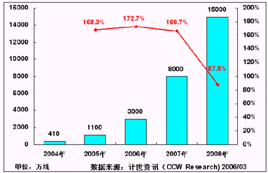 主流運營商NGN網(wǎng)絡的規(guī)模化建設,為IP Centrex、寬帶電話等新業(yè)務在國內(nèi)的大規(guī)模應用提供了良好的支撐。計世資訊(CCW Research)預計,在未來3年內(nèi),中國的NGN網(wǎng)絡建設規(guī)模將獲得快速增長,到2008年,將有望達到1.5億線的規(guī)模。