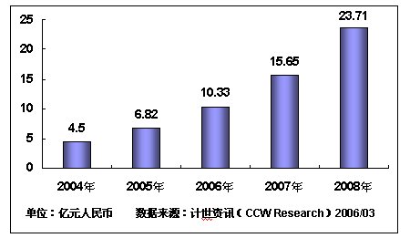 移動(dòng)信息化不僅是政府的規(guī)劃目標(biāo),也是帶動(dòng)其他行業(yè)、以致于整個(gè)社會(huì)經(jīng)濟(jì)發(fā)展的主要?jiǎng)恿。隨著3G的臨近,這一市場(chǎng)蘊(yùn)藏著的巨大商機(jī)漸漸顯露出來(lái)。目前,我國(guó)一些省市政府部門(mén)已經(jīng)開(kāi)始了不同程度的移動(dòng)政務(wù)應(yīng)用,計(jì)世資訊(CCW Research)數(shù)據(jù)表明,2005年,我國(guó)移動(dòng)政務(wù)市場(chǎng)規(guī)模達(dá)6.82億元,增長(zhǎng)率為51.6%,預(yù)計(jì)2006年,我國(guó)移動(dòng)政務(wù)市場(chǎng)規(guī)模將達(dá)到10.33億元,預(yù)計(jì)未來(lái)三年內(nèi),中國(guó)移動(dòng)政務(wù)復(fù)合增長(zhǎng)率將達(dá)到51.5%,截至2008年,我國(guó)移動(dòng)政務(wù)市場(chǎng)規(guī)模將突破20億元。