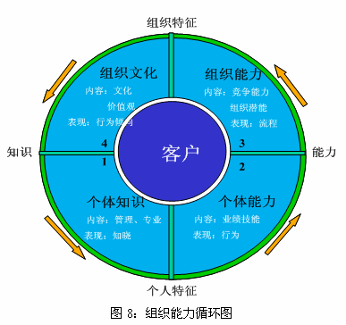 組織能力循環(huán)圖說明,管理者不僅要關注對組織中個體層次特性的管理,如個體知識、個體能力,更要關注組織層次特性的管理,如組織能力和企業(yè)文化。只有管理者將目光由個體能力轉(zhuǎn)向組織能力時,即更注重組織層次的能力建設時,組織才會真正地成長和發(fā)展。
