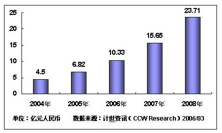 我國移動(dòng)電子政務(wù)已經(jīng)進(jìn)入高速發(fā)展時(shí)期:2005年的市場規(guī)模達(dá)6.82億元,增長率為51.6%;2006年將達(dá)到10.33億元。預(yù)計(jì)未來三年內(nèi),我國移動(dòng)電子政務(wù)復(fù)合增長率將達(dá)到51.5%,截至2008年,市場規(guī)模將突破20億元。