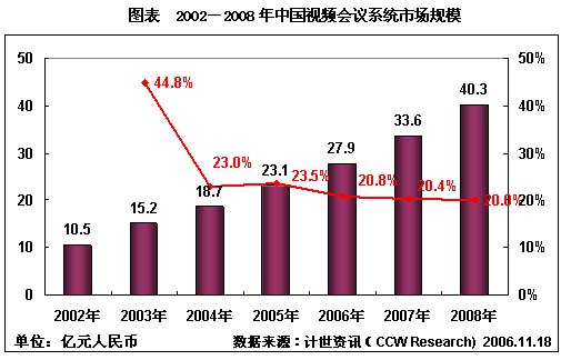在2003年的井噴式發(fā)展之后,視頻會議系統(tǒng)市場發(fā)展速度開始進入低速發(fā)展階段,市場逐漸出現(xiàn)飽和的趨勢。計世資訊(CCW Research)最新視頻會議報告數(shù)據(jù)顯示,從2003年非典時期視頻會議市場井噴式發(fā)展之后,2006年視頻會議系統(tǒng)的增長率開始下降,如何開發(fā)新的產(chǎn)品,成為視頻會議系統(tǒng)市場繼續(xù)發(fā)展的關(guān)鍵。而3G商用的到來,由此產(chǎn)生的移動視頻業(yè)務也必將成為未來移動通信新的市場增長點,可以說,移動信息化建設(shè)將為視頻會議系統(tǒng)開拓一片新的藍海。