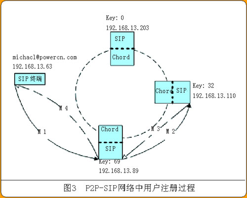 在本例中,SIP URI是michael@powercn.com,假定其哈希值是17,PN的Chord層會查找到負(fù)責(zé)處理該請求的PN Key值是32,find_responsible_pn(user)返回該P(yáng)N的“IP地址∶端口”——192.168.13.110:5060。PN的SIP層比較該值發(fā)現(xiàn)不是自己,就將注冊請求轉(zhuǎn)發(fā)到該“IP地址∶端口”,如圖3中M2所示。