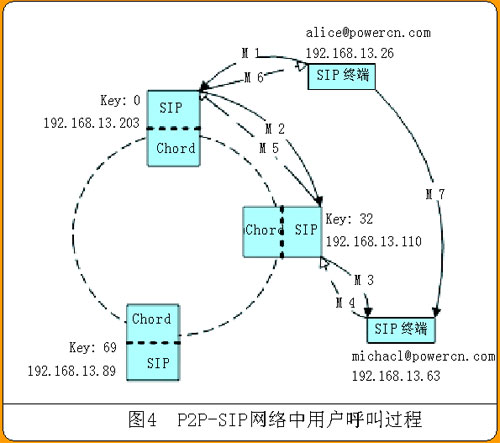 IP地址為192.168.13.26的用戶alice@powercn.com要呼叫用戶michael@powercn.com。alice可以把請求發(fā)給P2P-SIP網(wǎng)絡(luò)中任一PN?紤]到要在P2P-SIP網(wǎng)絡(luò)上提供增值業(yè)務(wù)(比如計(jì)費(fèi)),alice把INVITE請求發(fā)給管理它的PN更合適一點(diǎn),在本例中是IP為192.168.13.203,Key值為0的PN。如圖4中M1所示。