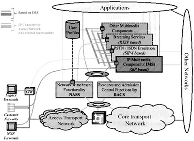 R6中的相關規(guī)范,但要求支持更多的接入方式,包括xDSL、WLAN、LAN、MAN等。此外,還定義了網(wǎng)絡附著子系統(tǒng)和資源準入控制子系統(tǒng)(RACS)。在這樣的框架下,NGN可以實現(xiàn)基于SIP的業(yè)務、基于SIP-I協(xié)議傳統(tǒng)業(yè)務以及基于RTSP的業(yè)務等。ETSI