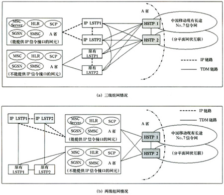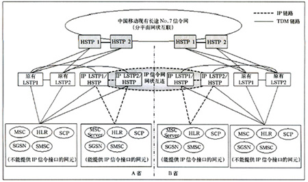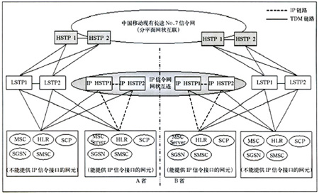 由于該方案下,不支持IP信令的網(wǎng)元同時(shí)與原有LSTP和新建的IP LSTP都連接,因此需要這些網(wǎng)元能夠判斷出對(duì)端省哪些網(wǎng)元支持IP信令,并選擇正確的路由(可以考慮通過為支持IP信令的網(wǎng)元設(shè)置特殊號(hào)段ID號(hào)的方式實(shí)現(xiàn));蛘咭部梢宰尣恢С諭P信令的網(wǎng)元只與現(xiàn)有LSTP相連,由LSTP負(fù)責(zé)判斷將省際信令送至現(xiàn)有長途信令網(wǎng)還是IP信令網(wǎng)(同樣要求LSTP能夠判斷對(duì)端省哪些網(wǎng)元支持IP信令),但會(huì)增加信令的跳數(shù)(三級(jí)組網(wǎng))。考慮到今后信令I(lǐng)P化的趨勢,為節(jié)省投資,不建議新建的支持IP信令的網(wǎng)元再配置TDM信令接口,這些網(wǎng)元只通過IP接口與IP LSTP相連。
