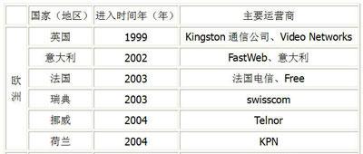 歐洲部分國家和地區(qū)進(jìn)入IPTV市場(chǎng)的年份及主要運(yùn)營商