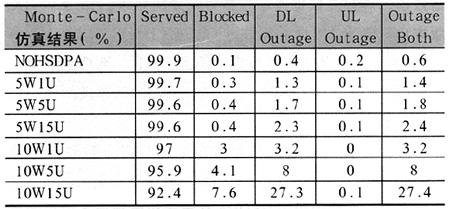 通過表3可以看出,隨著HSDPA功率分配的增加,網(wǎng)絡阻塞率和下行鏈路功率過載隨之增加,特別是功率增加到10W時,增加幅度尤為明顯;在一定的HSDPA功率分配前提下,隨著網(wǎng)內HSDPA用戶數(shù)的增加,網(wǎng)絡阻塞率和下行鏈路功率過載隨之增加,特別是用戶數(shù)增加到15人時,增加幅度尤為明顯?梢奌SDPA網(wǎng)絡性能在一定程度上受限于HSDPA功率分配和網(wǎng)內HSDPA用戶數(shù)。