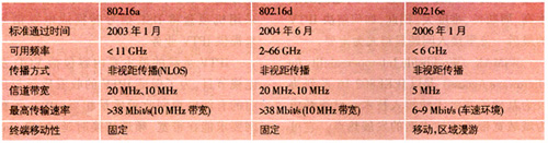 。。最早的IEEE802.16標準是在2001年12月獲得批準的。目前所說的802.16標準主要包括802.16a、802.16d和802.16e三個標準。802.16e作為支持終端中低速移動的寬帶無線接入標準,已于2006年初正式通過IEEE批準,這三個標準主要的特點見表1。