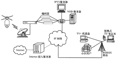 。。WiMAX網(wǎng)絡(luò)支持豐富多彩的業(yè)務模式。不同速率的數(shù)據(jù)業(yè)務是網(wǎng)絡(luò)的主要承載目標。WiMAX支持不同的QoS級別,因此網(wǎng)絡(luò)覆蓋范圍與業(yè)務類型緊密相關(guān)。在IPTV的接入方面,由于IPTV需要高級別的QoS保證以及高速的數(shù)據(jù)傳輸速率,所以根據(jù)小區(qū)內(nèi)用戶的數(shù)量以及需求,合理設(shè)置WiMAX網(wǎng)絡(luò)。用戶接入IPTV網(wǎng)絡(luò)的時候。不需要再次進行布線,只需加裝WiMAX接收設(shè)備和IP機頂盒即可,因此用戶可以方便、快捷地使用IPTV業(yè)務。WiMAX實現(xiàn)IPTV的接入如圖1所示。