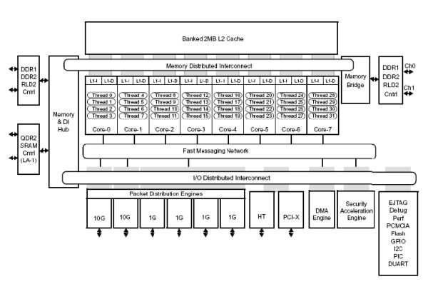 Chuck hill指出,能實(shí)現(xiàn)如此高速下的安全功能,得益于它采用了多核MIPS64數(shù)據(jù)包處理器,這是來(lái)自Raza 微電子(RMI)的XLR處理器,它最多有8個(gè)MIPS64內(nèi)核,可以實(shí)現(xiàn)4路多線程,每秒可以處理2000萬(wàn)個(gè)數(shù)據(jù)包。在XLR芯片中集成了可以處理DES、3DES、AES、ARC4、SHA-1、MD5和RSA/DH加密/解密算法的專用安全處理器。1個(gè)、2個(gè)或4個(gè)加密內(nèi)核能使安全引擎提供2.5到10Gbps吞吐量的大塊數(shù)據(jù)加密/解密。安全引擎還包含有用于內(nèi)部IPsec、SSL和其它安全應(yīng)用的隨機(jī)數(shù)字發(fā)生器和RSA/DH求冪算法。Chuck