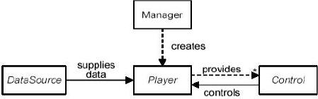 Manager將對createPlayer函數(shù)中提供的URL字符串參數(shù)進行分析,創(chuàng)建一個Data Source對象,由該對象完成對媒體數(shù)據(jù)的傳輸工作,并從數(shù)據(jù)中獲取該媒體的數(shù)據(jù)內(nèi)容類型,Manager將根據(jù)這個媒體數(shù)據(jù)類型創(chuàng)建相應(yīng)的Player對象,如果Manager無法確定DataSource的內(nèi)容類型,它將拋出一個MediaException異常。