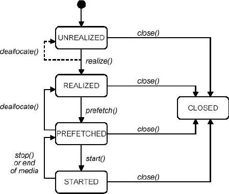 每個Player對象中都存在著一個狀態(tài)變量,用于表示該Player對象的生命周期。當(dāng)Player第一次被建立時處于UNREALIZED狀態(tài);當(dāng)為該Player設(shè)置了媒體數(shù)據(jù)的位置后,它處于REALIZED狀態(tài)(如Player正在從一個服務(wù)器的HTTP連接下載并解釋數(shù)據(jù)的時或Player在Http請求已經(jīng)發(fā)送到服務(wù)器,收到HTTP響應(yīng)后,而且DataSource準(zhǔn)備好接收媒體數(shù)據(jù)的時);當(dāng)該Player已經(jīng)讀到足夠的數(shù)據(jù)而開始解釋和運算時,處于PREFETCHED狀態(tài);當(dāng)數(shù)據(jù)在運算完畢后,該Player的狀態(tài)變成了STARTED。我們在使用Player對象的方法對媒體流進行控制時,應(yīng)注意它們可能影響到Player狀態(tài)的改變,可以使用getState函數(shù)獲取當(dāng)前Player的狀態(tài)。圖三展示了Player對象的狀態(tài)轉(zhuǎn)換圖。