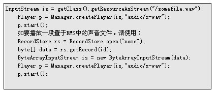 如要播放一段已經(jīng)被置于MIDlet的JAR文件中的聲音文件,需要先了解其MIME類型(如,"audio/x-wav"),然后,使用: