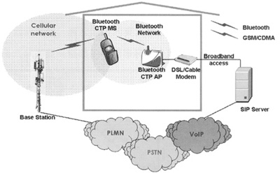如圖4所示,使用藍(lán)牙CTP手機和具有CTP功能的VoIP接入點,即CTP-SIP AP,通過寬帶網(wǎng)絡(luò)與VoIP網(wǎng)絡(luò)相連。這里的VoIP網(wǎng)絡(luò)支持SIP協(xié)議,VoIP接入點支持藍(lán)牙CTP和SIP協(xié)議,MS則不需要具備SIP功能。CTP-SIP