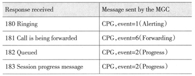 MGC收到的響應(yīng)消息中,如果是100 trying消息則網(wǎng)關(guān)不觸發(fā)任何PSTN消息。如果是18x消息,且消息體中沒(méi)有ISUP消息,此時(shí)網(wǎng)關(guān)需要判斷在此之前是否有ACM發(fā)送出去。如果之前沒(méi)有ACM發(fā)送出去,MGC將依據(jù)表1來(lái)響應(yīng)消息。