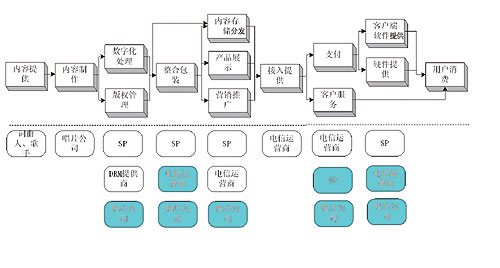 在線音樂業(yè)務的內(nèi)容一般由唱片公司提供,然后經(jīng)過在線音樂服務商的包裝,最后呈現(xiàn)給用戶。所以在線音樂業(yè)務的價值鏈大概由以下幾個環(huán)節(jié)構成:內(nèi)容提供、內(nèi)容制作、數(shù)字化處理、版權管理、整合包裝、內(nèi)容存儲分發(fā)、產(chǎn)品展示、營銷推廣、接入提供、支付、客戶服務、客戶端軟件提供、硬件提供和用戶消費等。