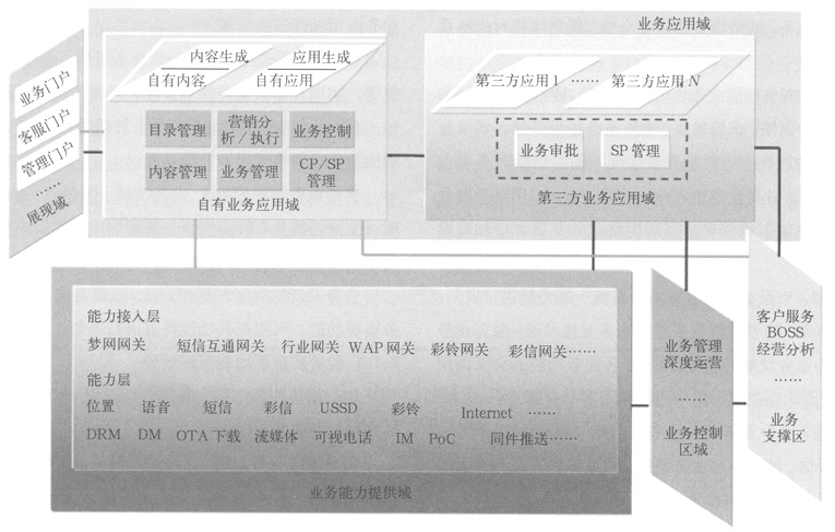 *業(yè)務能力提供區(qū):由于目前主要業(yè)務能力提供系統(tǒng)已實現(xiàn)接口的標準化,可采用邏輯上劃分應用層和能力、資源層,并統(tǒng)一管理調(diào)用該能力提供功能的SP及用戶信息;