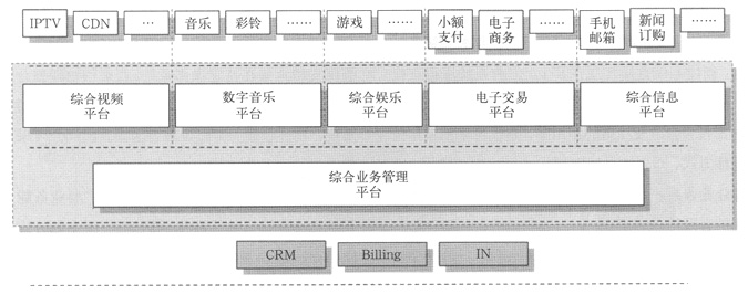 。3)對各增值業(yè)務缺乏統(tǒng)一分析、規(guī)劃、運營機制。由于用戶習慣、市場發(fā)展、增值業(yè)務特征等使各增值業(yè)務平臺功能在不同時期開展情況不同,需要對各平臺用戶信息、業(yè)務信息進行統(tǒng)一提取、分析,用以幫助業(yè)務功能整體架構(gòu)部署、靈活調(diào)整業(yè)務發(fā)展策略和建設策略。