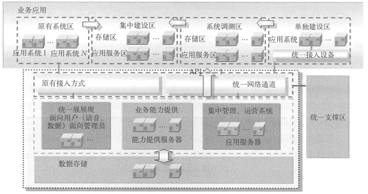 。5)應用業(yè)務區(qū):統(tǒng)一搭建應用硬件平臺,實現(xiàn)應用業(yè)務區(qū)業(yè)務應用及業(yè)務能力提供區(qū)接入通道類型的新增,均可直接在其硬件平臺上加載應用軟件、提供服務,調(diào)用現(xiàn)有資源實現(xiàn)。個別因為系統(tǒng)本身需求需要單獨建設、部署的系統(tǒng)則保留其單獨建設的方式。