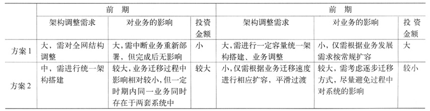 根據(jù)網(wǎng)絡演進架構(gòu)清晰度、實施難度、投資金額等綜合因素考慮,對以上方案分析對比如表1所示。