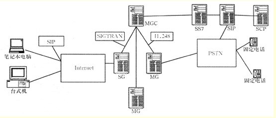 隨著用戶規(guī)模的擴(kuò)大以及用戶對(duì)業(yè)務(wù)需求的增長,網(wǎng)關(guān)在規(guī)模上要不斷擴(kuò)大。集中型的網(wǎng)關(guān)結(jié)構(gòu)在可擴(kuò)展性、安全性以及組網(wǎng)的靈活性方面的不足日益顯露出來。因此,將業(yè)務(wù)、控制和信令分離的概念被提了出來,即將IP電話網(wǎng)關(guān)分離成三部分:信令網(wǎng)關(guān)(SG)、媒體網(wǎng)關(guān)(MG)和媒體網(wǎng)關(guān)控制器(MGC)。SG負(fù)責(zé)處理信令消息,將其終結(jié)、翻譯或中繼;MG負(fù)責(zé)處理媒體流,將媒體流從窄帶網(wǎng)打包送到IP網(wǎng)或者從IP網(wǎng)接收后解包并送給窄帶網(wǎng);MGC負(fù)責(zé)MG資源的注冊(cè)、管理以及呼叫控制。在這種分布式網(wǎng)關(guān)體系結(jié)構(gòu)中,MG和MGC之間采用H.248協(xié)議,SG和MGC之間采用SIGTRAN協(xié)議。