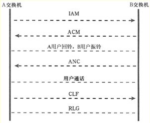 PSTN電話通過No.7信令來建立連接過程,通常采用G.711的PCM編碼格式傳輸,傳輸速率64 kbit/s。PSTN網(wǎng)絡(luò)通話流程如圖2所示。在PSTN通信過程中,A交換機(jī)首先通過發(fā)出IAM發(fā)起呼叫,其中包括被叫號(hào)碼。B交換機(jī)確定被叫空閑后發(fā)出ACM地址全信號(hào)通知A,此時(shí)B交換機(jī)通過A交換機(jī)對(duì)主叫用戶發(fā)送回鈴音,B交換機(jī)向被叫用戶振鈴。被叫摘機(jī)后,B交換機(jī)發(fā)ANC計(jì)費(fèi)應(yīng)答信號(hào)通知A,振鈴和回鈴?fù)V梗p方用戶開始通話。通話結(jié)束后主叫用戶先掛機(jī),A交換機(jī)發(fā)出CLF前向釋放信號(hào)通知B,B收到后拆線并發(fā)出RLG釋放監(jiān)護(hù)信號(hào)通知A交換機(jī)。