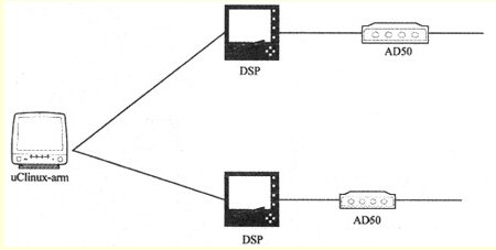 下一代媒體網(wǎng)關(guān)系統(tǒng)主要由媒體網(wǎng)關(guān)、媒體網(wǎng)關(guān)控制器和信令網(wǎng)關(guān)組成,實(shí)現(xiàn)了功能上的分解。為了適應(yīng)不同的網(wǎng)絡(luò),本文主要介紹了媒體網(wǎng)關(guān)的實(shí)現(xiàn)方法,其中媒體網(wǎng)關(guān)的主要作用是實(shí)現(xiàn)模擬信號(hào)由電路交換轉(zhuǎn)換成數(shù)字信號(hào)PCM編碼,并進(jìn)行G.711或者G.723等格式編碼。為了實(shí)現(xiàn)媒體網(wǎng)關(guān),整個(gè)系統(tǒng)由3部分組成,包括基于ARM架構(gòu)的嵌入式系統(tǒng)(uClinux)、語音信號(hào)轉(zhuǎn)換芯片(TLC320AD50)和定點(diǎn)數(shù)字信號(hào)處理器(TMS320VC54xx),如圖3所示。