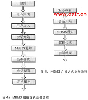 MBMS可應(yīng)用組播模式和廣播模式兩種業(yè)務(wù)模式。廣播模式接近于數(shù)字電視業(yè)務(wù),而組播模式專注和定位于群業(yè)務(wù)。組播模式提供了更好的計費特性,包括服務(wù)訂閱、接入和推出功能,需要用戶簽約相應(yīng)組播組,進行業(yè)務(wù)激活,并產(chǎn)生相應(yīng)的計費信息,而廣播業(yè)務(wù)不需要小區(qū)中所有用戶都制定該業(yè)務(wù)便可以獲得。由于組播和廣播模式在業(yè)務(wù)需求上存在不同,導致其業(yè)務(wù)流程也不同(見圖4a、圖4b)。